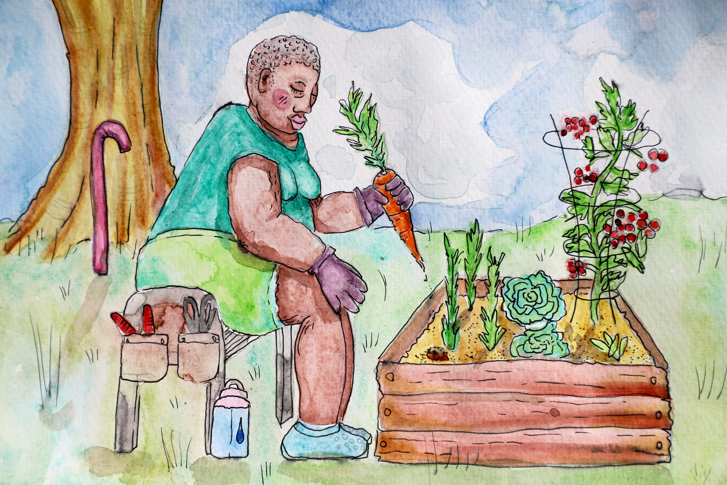 Image description: watercolor image of a Black elder with short graying hair harvesting carrots while sitting on a gardening bench with tools in pockets on the side of the bench. A water bottle is at their feet and their single point cane is visible leaning up against a tree in the background. It is a sunny day and their raised garden bed also houses cabbage, tomatoes and herbs. Painting by Shoog McDaniel.
